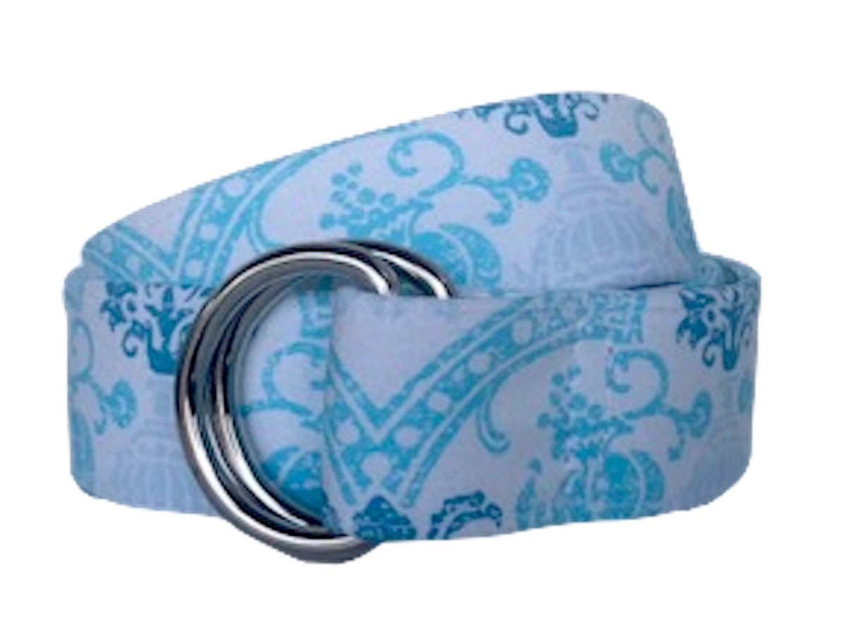 This fun blues and white style fabric was selected by us and made for you! This fabric belt is from our Signature Series Line. Each belt is hand made and made to order. Easily show off your casual style and pair this belt with any style khakis, jeans or your favorite cargo short. Each belt is hand made in the U.S.A and made to order. This belt is pictured with our polished steel d-rings. Other buckle options and webbing colors are available in the drop down menus.