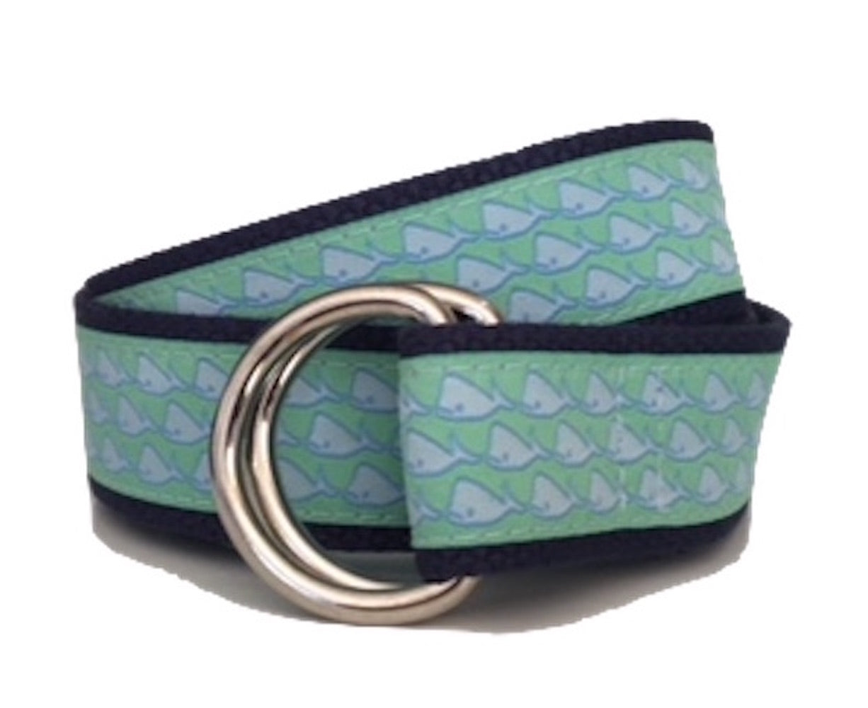 This blue whale ribbon print was designed by us and made for you! This ribbon belt is from our Signature Series Line. Each belt is hand made and made to order. Easily show off your casual style and pair this belt with any style khakis, jeans or your favorite cargo short. Each belt is hand made in the U.S.A and made to order. This belt is pictured with our polished steel d-rings. Other buckle options and webbing colors are available in the drop down menus.