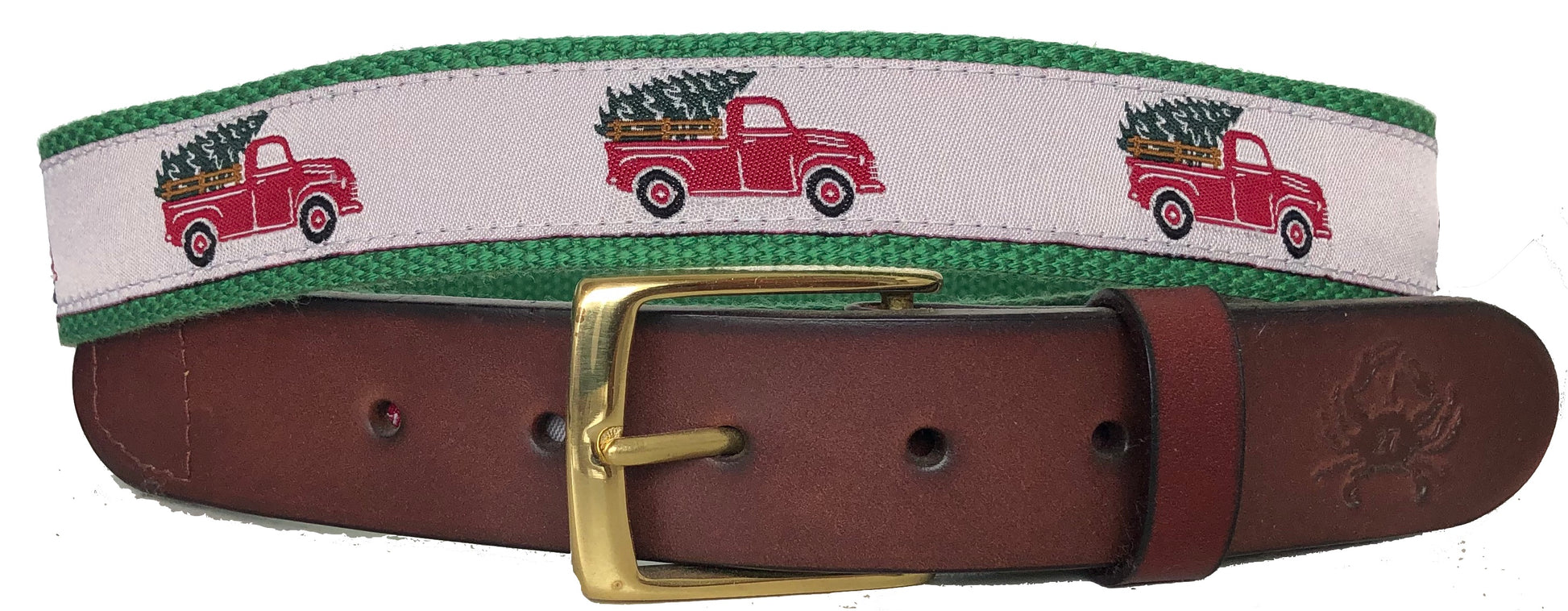 - Ribbon is a repeated pattern of a classic red pick up truck with a Christmas Tree in tow with a light gray/tan background