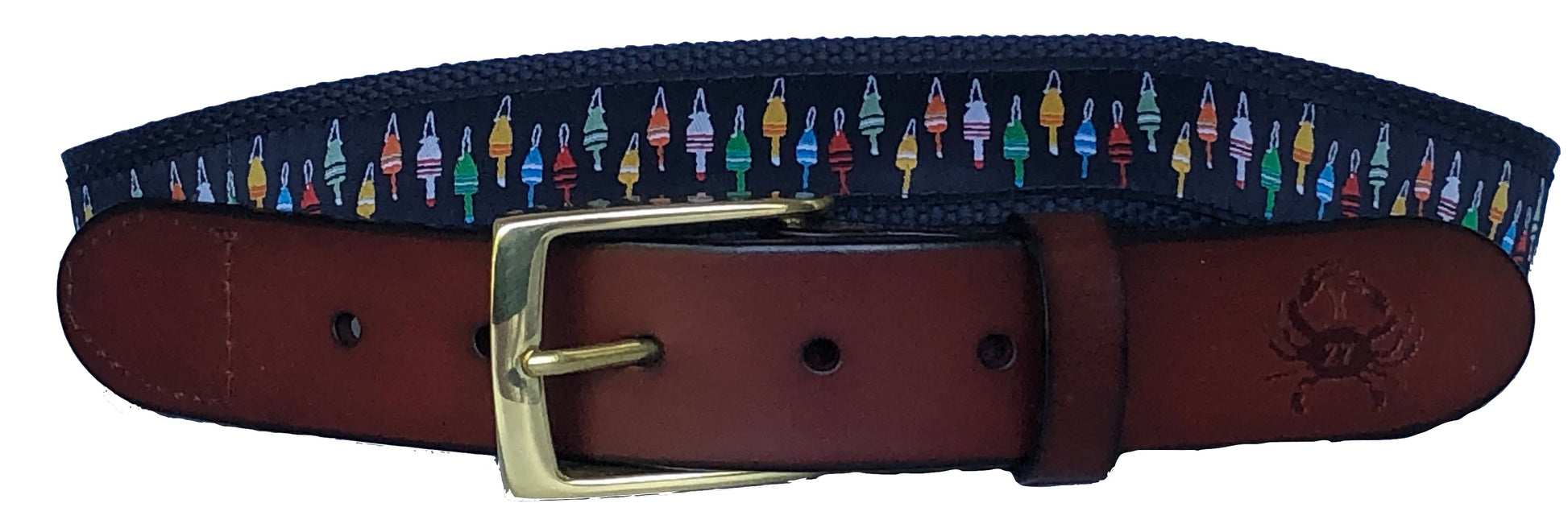 This signature Lobster Buoy Fishing print was designed by us and made for you! This ribbon belt is from our Signature Series Line. Easily show off your casual style and pair this belt with any style khakis, jeans or your favorite cargo short. Each belt is hand made in the U.S.A and made to order. This belt is pictured with our 1.25" Brass color buckle. Other Styles are available in the drop down menu.