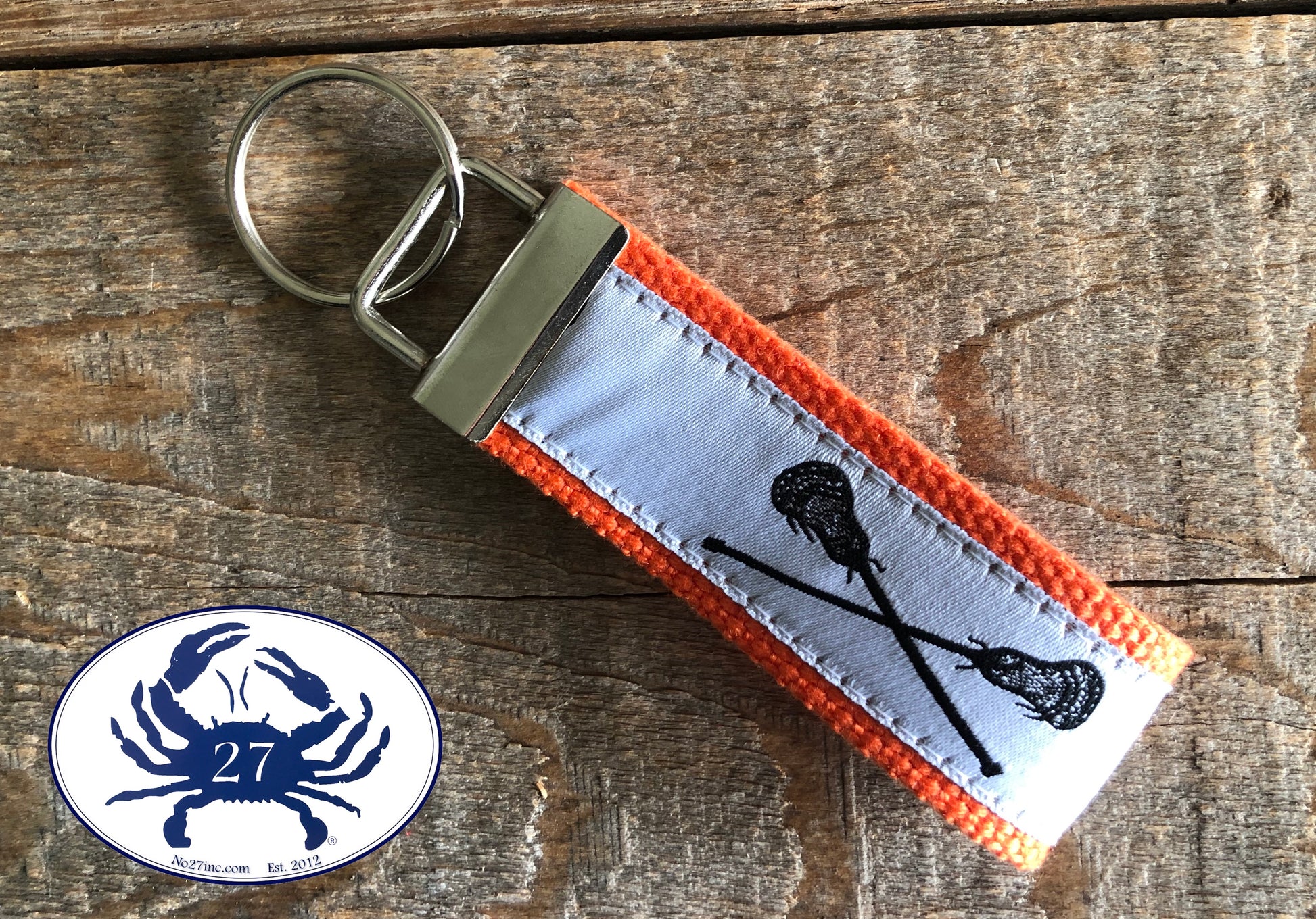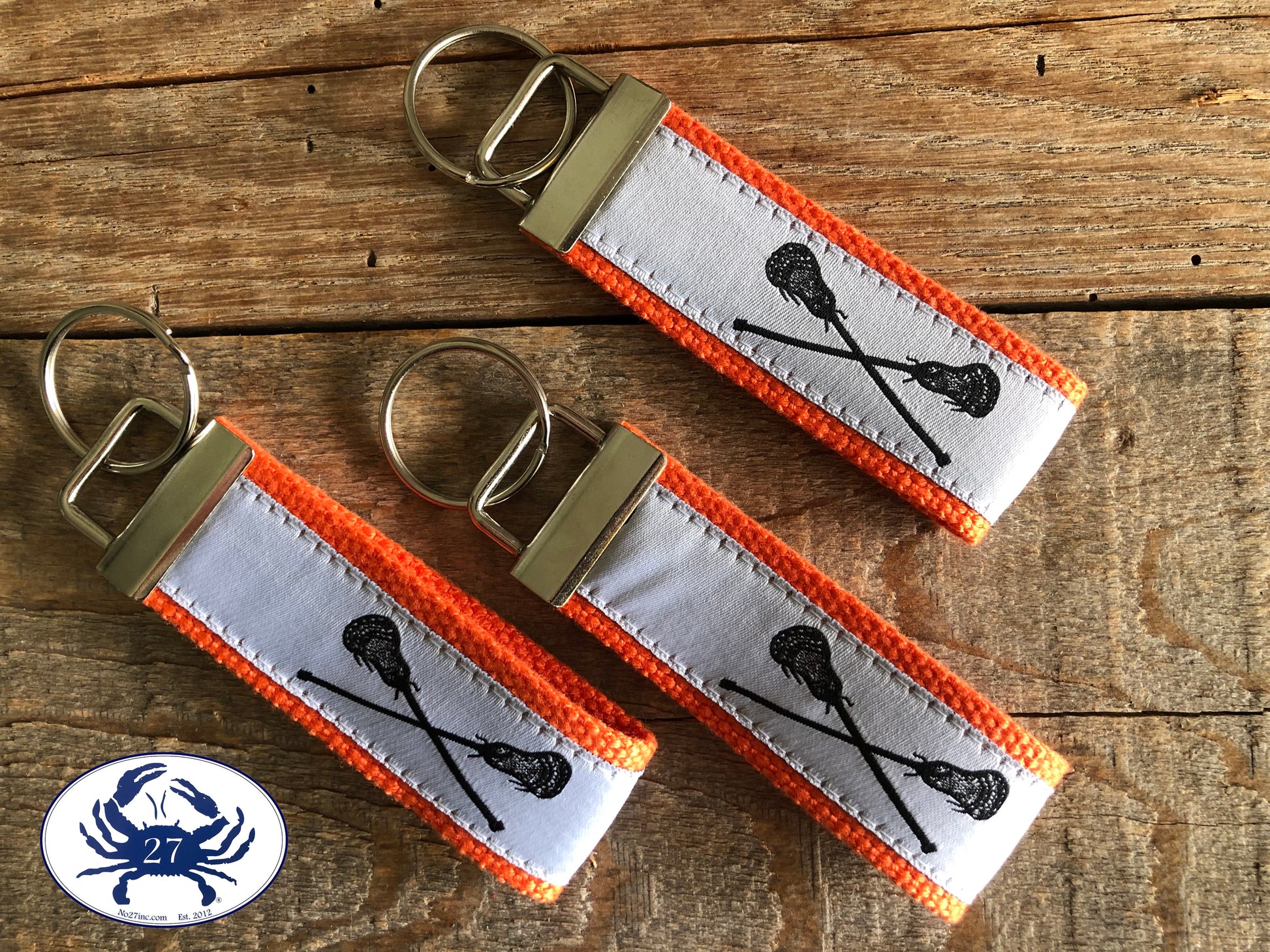 Have fun with this fresh and colorful key chain. This key chain features 'Black Lacrosse Sticks on White' ribbon for a fun classic style. This key chain is made to order, so you can select an alternate webbing color or length. The key chain is pictured in 4" in length (not including the o-ring, which is an additional .5")