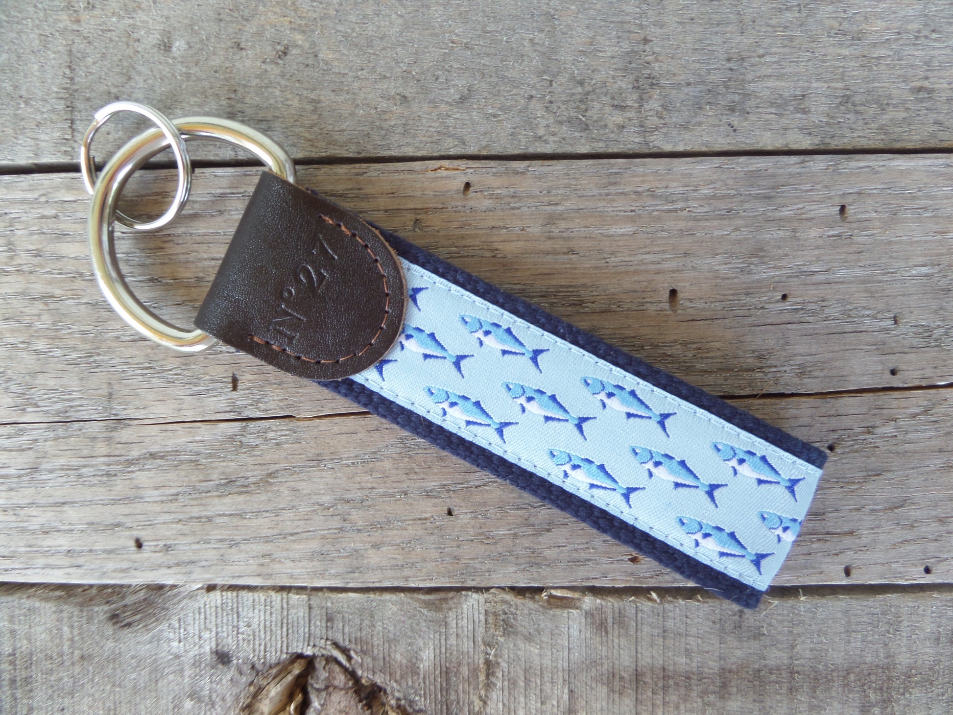 This nautical bluefish print was designed by us and made for you! This key chain is made to order. You select the webbing, hardware style and length. If you have a custom request (monogram or other) please just let us know