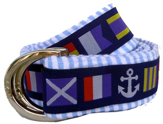 Nautical Flag and Blue Seersucker Fabric D-Ring Belt