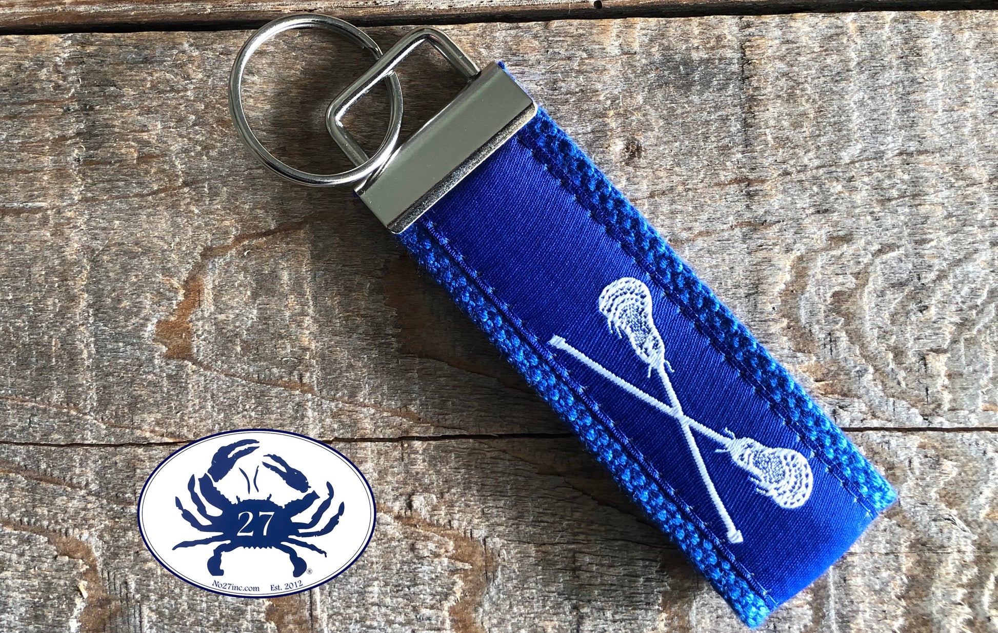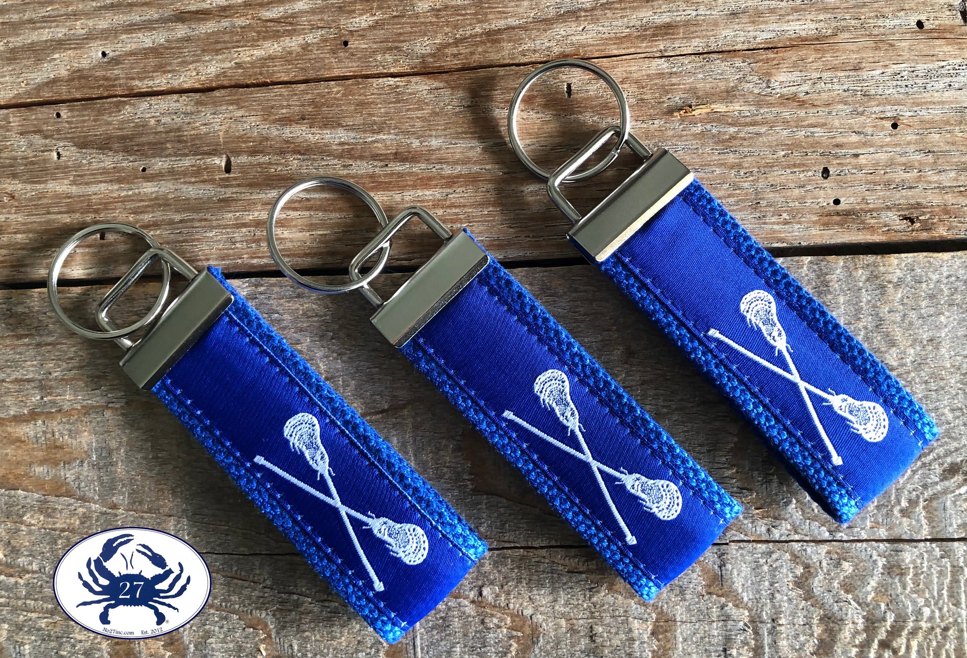 Have fun with this fresh and colorful key chain. This key chain features 'White Lacrosse Sticks on Royal Blue' ribbon for a fun classic style. This key chain is made to order, so you can select an alternate webbing color or length. The key chain is pictured in 4" in length (not including the o-ring, which is an additional .5")