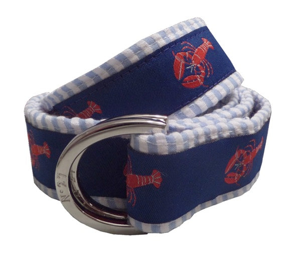 Lobster and Blue Seersucker Fabric D-Ring Belt