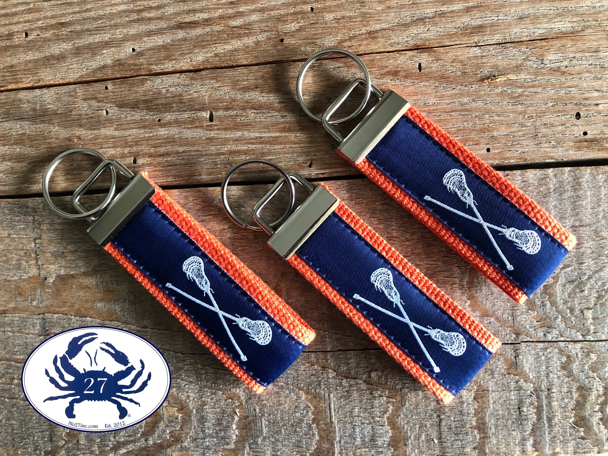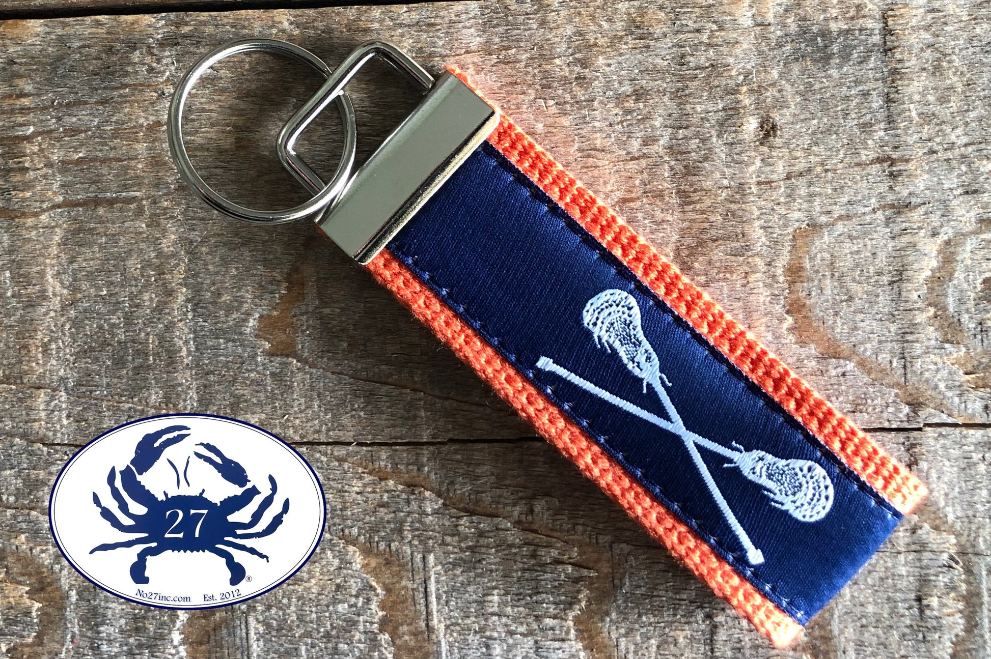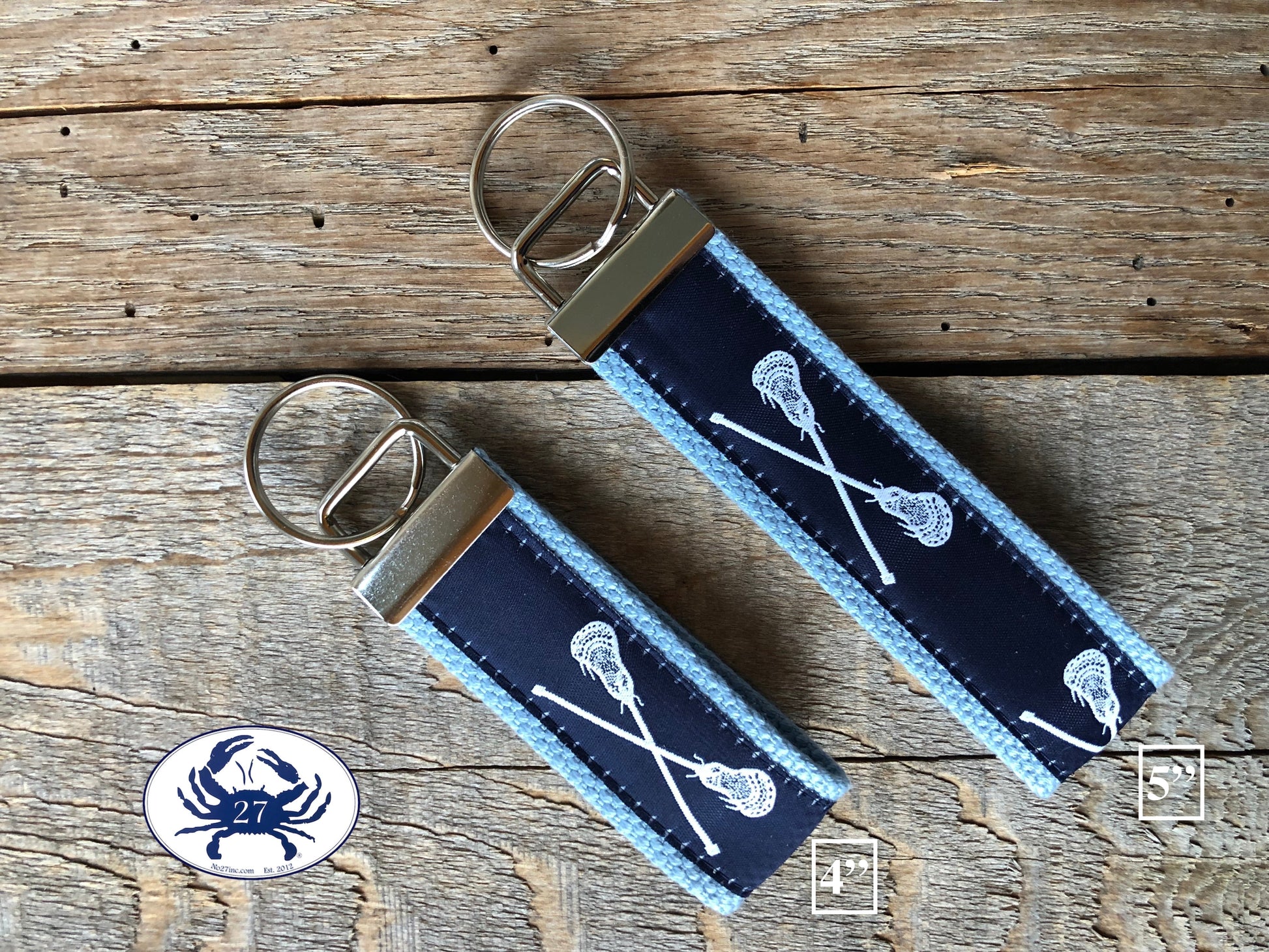 Have fun with this fresh and colorful key chain. This key chain features 'Royal blue Lacrosse Sticks on White' ribbon for a fun classic style. This key chain is made to order, so you can select an alternate webbing color or length. The key chain is pictured in 4" in length (not including the o-ring, which is an additional .5")