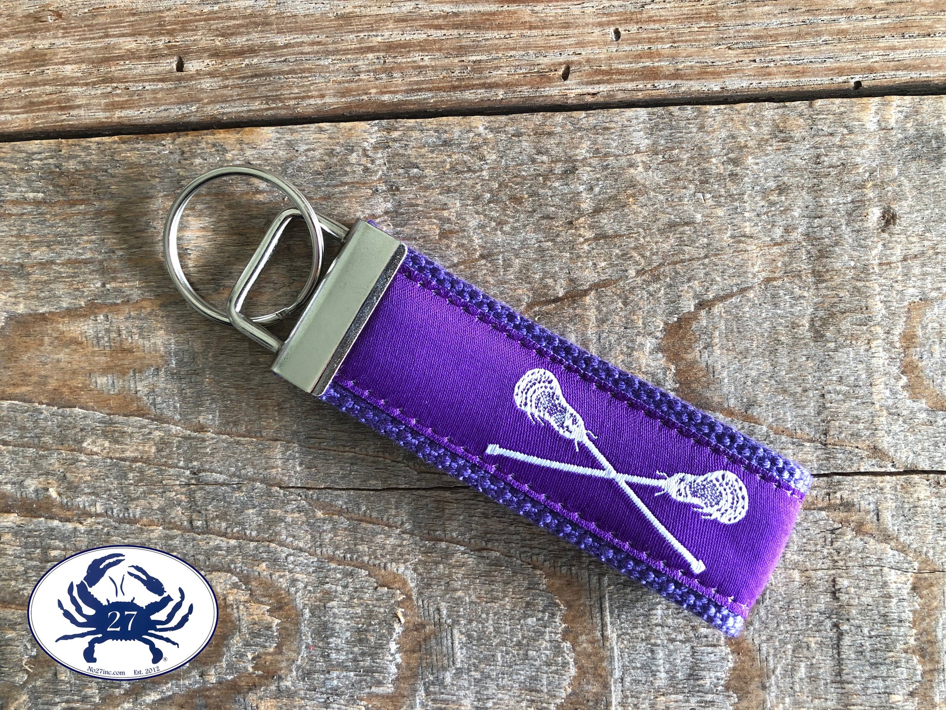 Have fun with this fresh and colorful key chain. This key chain features 'White Lacrosse Sticks on Purple' ribbon for a fun classic style. This key chain is made to order, so you can select an alternate webbing color or length. The key chain is pictured in 4" in length (not including the o-ring, which is an additional .5")