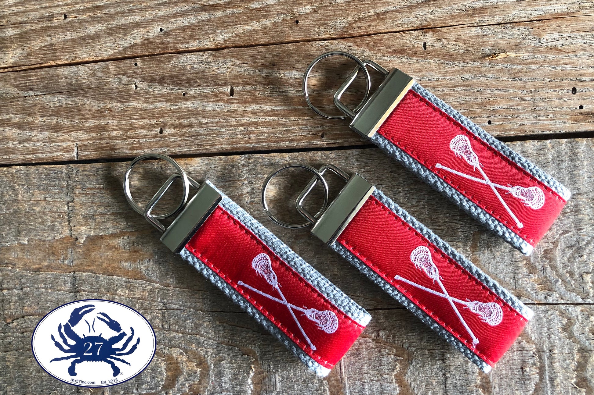 Have fun with this fresh and colorful key chain. This key chain features 'White Lacrosse Sticks on Red' ribbon for a fun classic style. This key chain is made to order, so you can select an alternate webbing color or length. The key chain is pictured in 4" in length (not including the o-ring, which is an additional .5")
