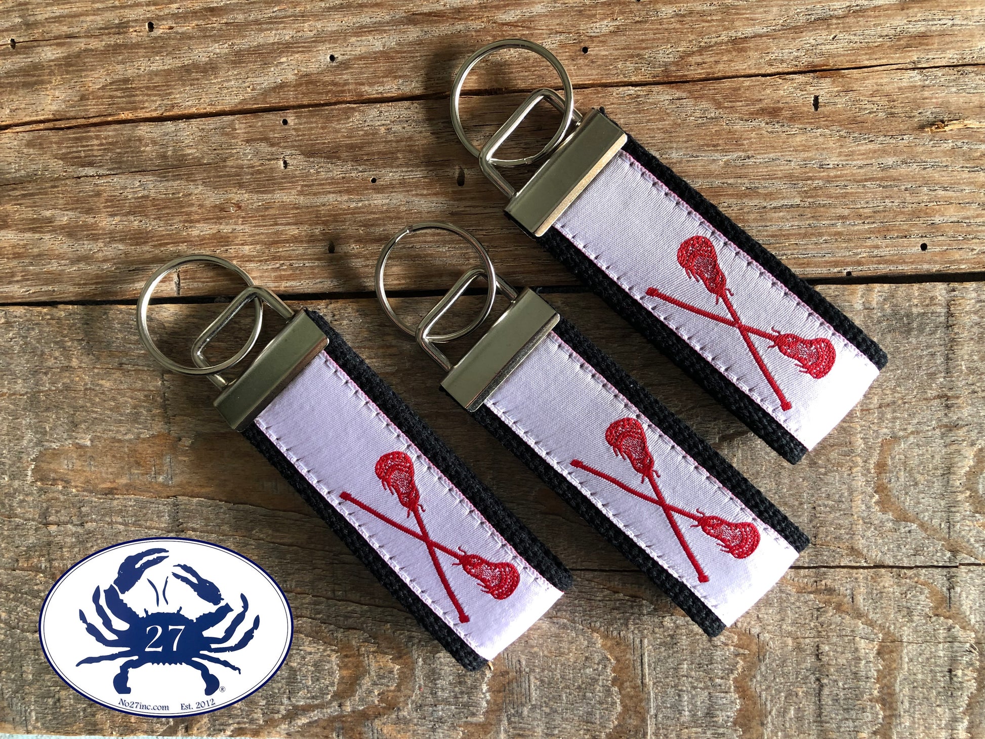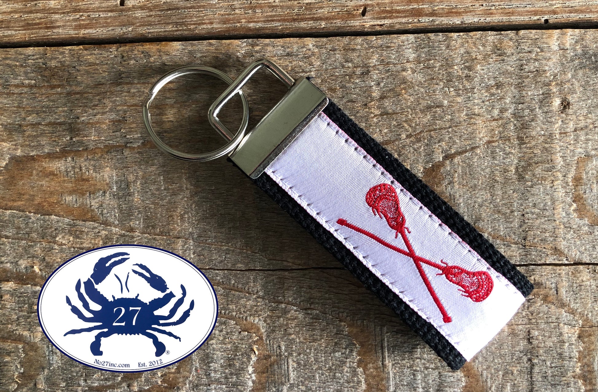 Have fun with this fresh and colorful key chain. This key chain features 'red Lacrosse Sticks on White' ribbon for a fun classic style. This key chain is made to order, so you can select an alternate webbing color or length. The key chain is pictured in 4" in length (not including the o-ring, which is an additional .5")