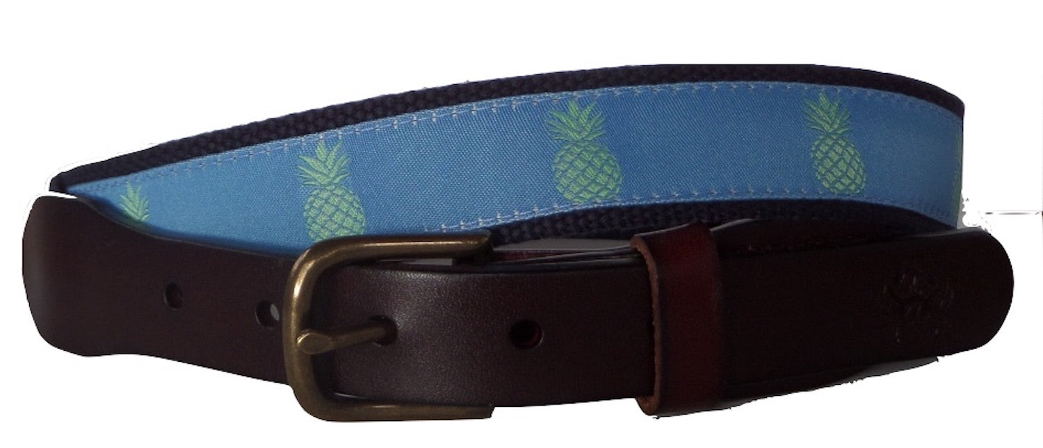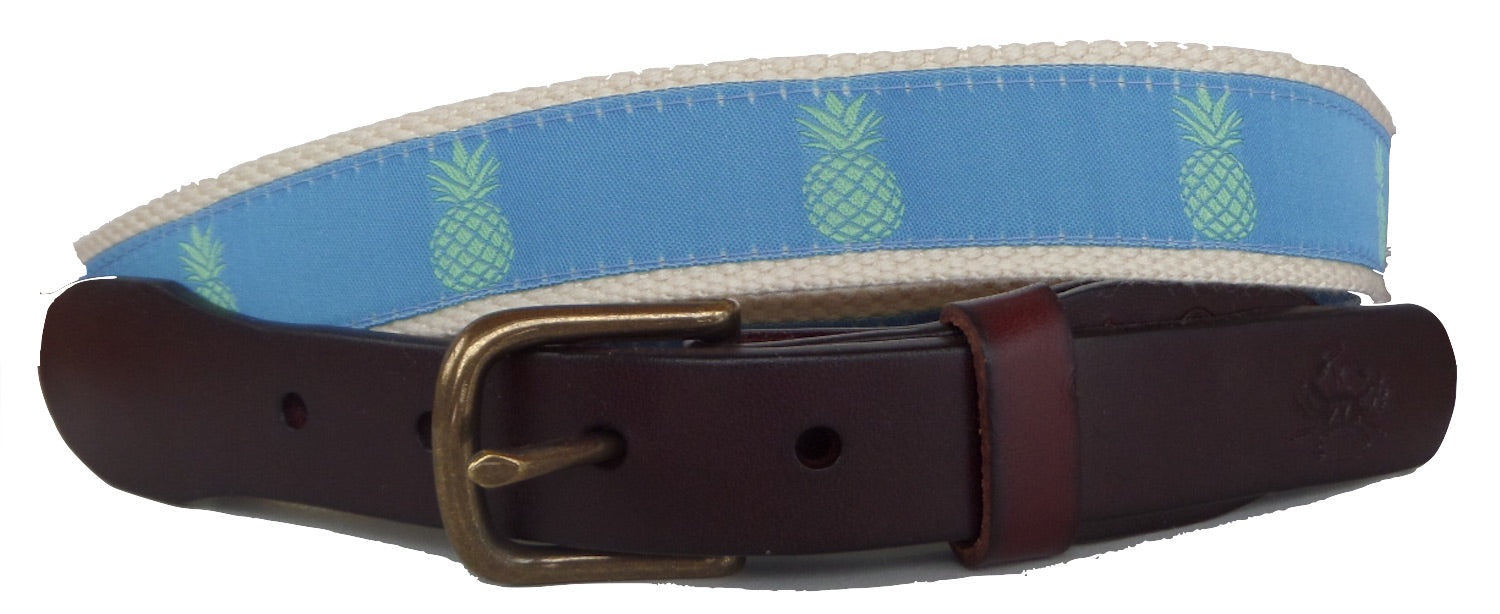 This novelty green pineapple print was designed by us and made for you! This ribbon belt is from our Signature Series Line. Easily show off your casual style and pair this belt with any style khakis, jeans or your favorite cargo short. Each belt is hand made in the U.S.A and made to order. This belt is pictured with both our 1" and 1.25" Brass color buckle. Other Styles are available in the drop down menu.