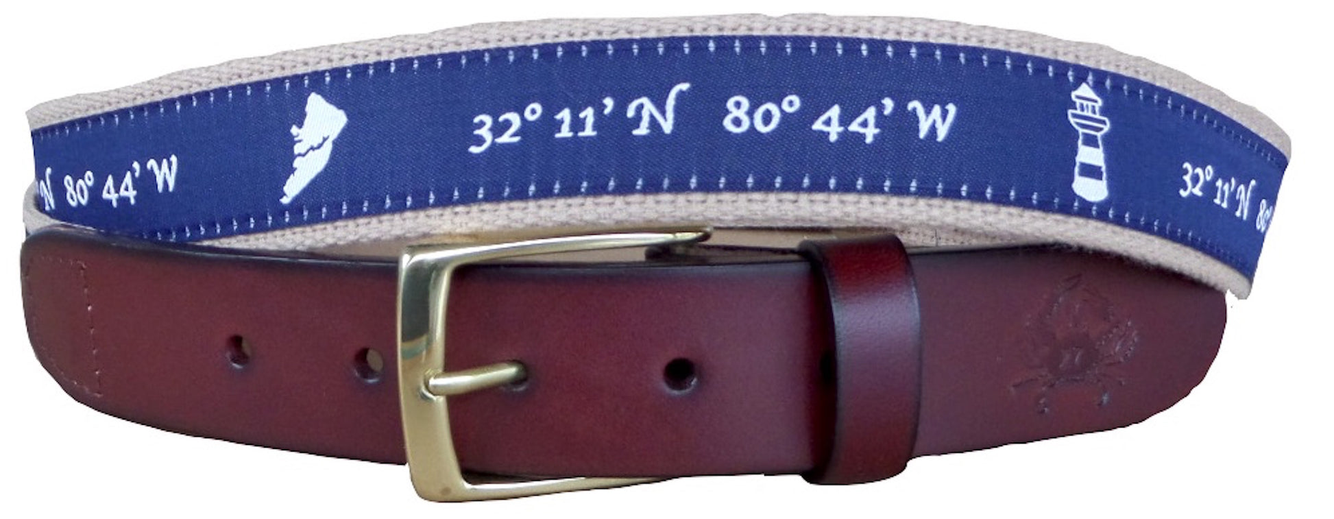 This signature Hilton Head Island print was designed by us and made for you! This ribbon belt is from our Signature Series Line. Easily show off your casual style and pair this belt with any style khakis, jeans or your favorite cargo short. Each belt is hand made in the U.S.A and made to order. This belt is pictured with our 1.25" Brass color buckle. Other Styles are available in the drop down menu.