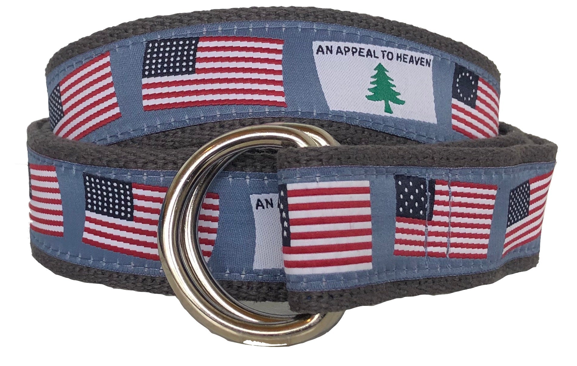This signature American Flag print was designed by us and made for you! This ribbon belt is from our Signature Series Line. Easily show off your casual style and pair this belt with any style khakis, jeans or your favorite cargo short. Each belt is hand made in the U.S.A and made to order. This belt is pictured with our 1.25" Brass color buckle. Other Styles are available in the drop down menu.