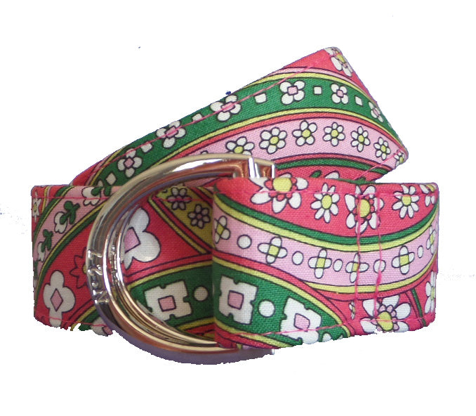 This classy spring daisy fabric was selected by us and made for you! This fabric belt is from our Signature Series Line. Each belt is hand made and made to order. Easily show off your casual style and pair this belt with any style khakis, jeans or your favorite cargo short. Each belt is hand made in the U.S.A and made to order. This belt is pictured with our polished steel d-rings. Other buckle options and webbing colors are available in the drop down menus.