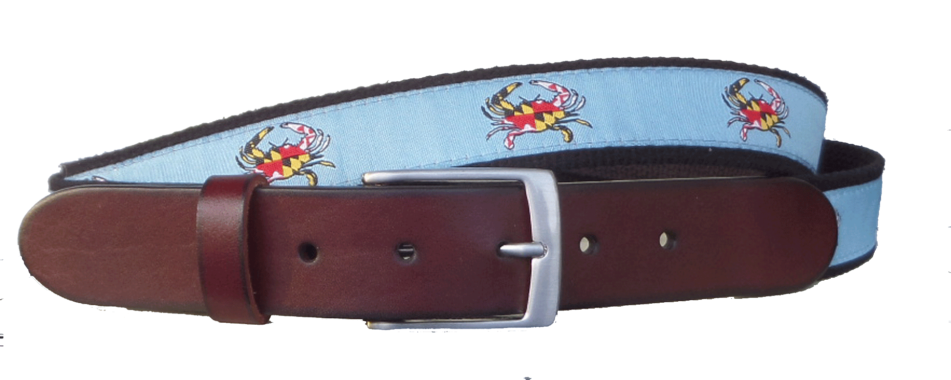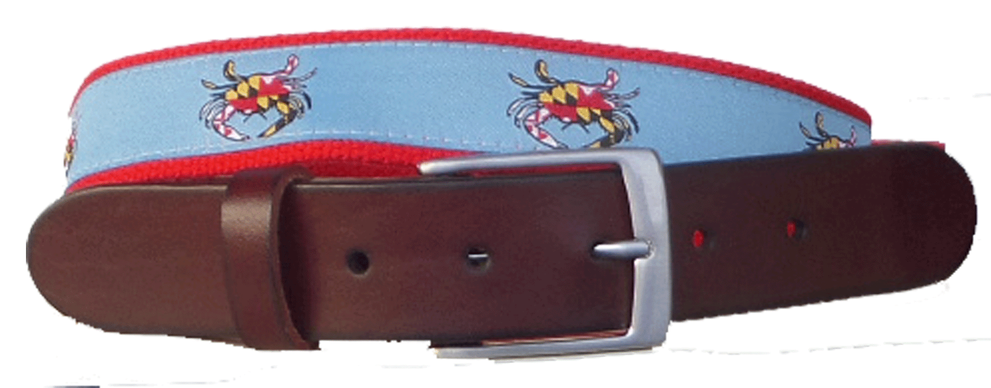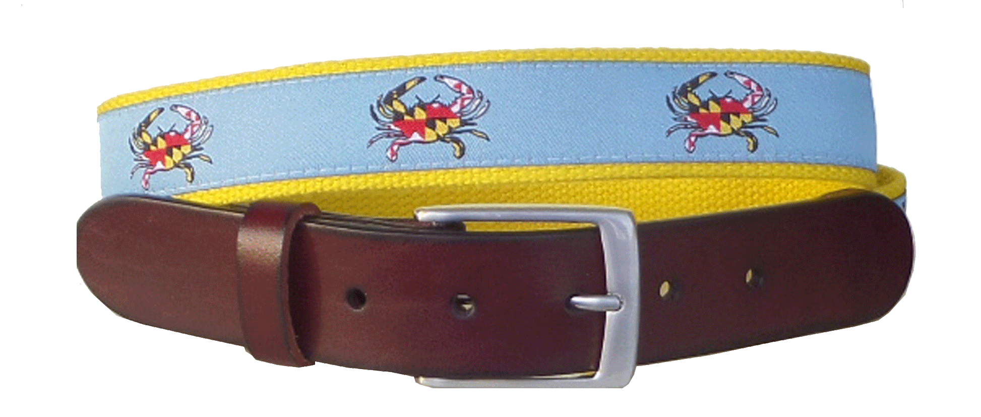 This classic Maryland Flag crab print was designed by us and made for you! This ribbon belt is from our Signature Series Line. Easily show off your casual style and pair this belt with any style khakis, jeans or your favorite cargo short. Each belt is hand made in the U.S.A and made to order. This belt is pictured with our 1.25" Pewter color buckle. Other Styles are available in the drop down menu.