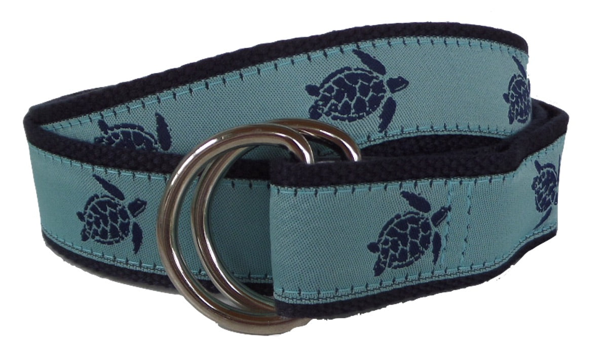 This navy blue sea turtle ribbon print was designed by us and made for you! This ribbon belt is from our Signature Series Line. Each belt is hand made and made to order. Easily show off your casual style and pair this belt with any style khakis, jeans or your favorite cargo short. Each belt is hand made in the U.S.A and made to order. This belt is pictured with our polished steel d-rings. Other buckle options and webbing colors are available in the drop down menus.