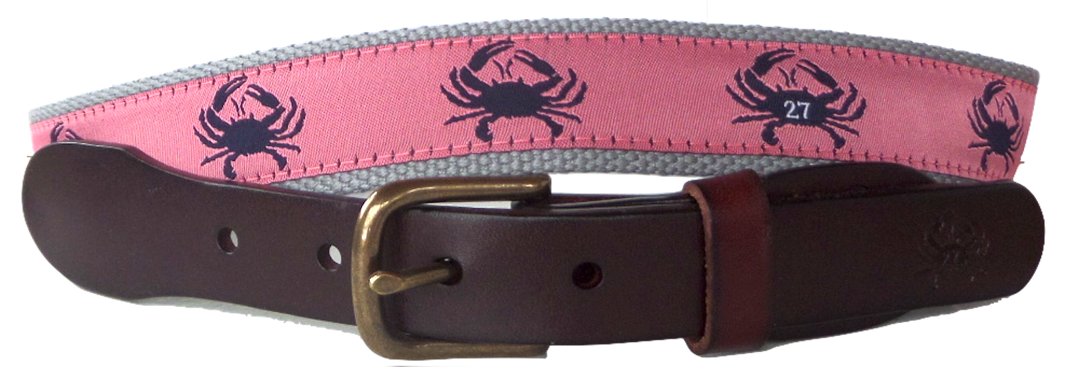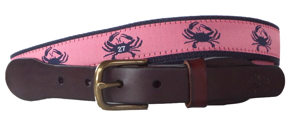Our No27 Crab logo is our registered trademark and is a print that we all wear proudly. It was designed by us and now you can join our style and wear it too! This ribbon belt is from our Signature Series Line. Easily show off your casual style and pair this belt with any style khakis, jeans or your favorite cargo short. Each belt is hand made in the U.S.A and made to order. This belt is pictured with our 1" Brass color buckle. Other Styles are available in the drop down menu.