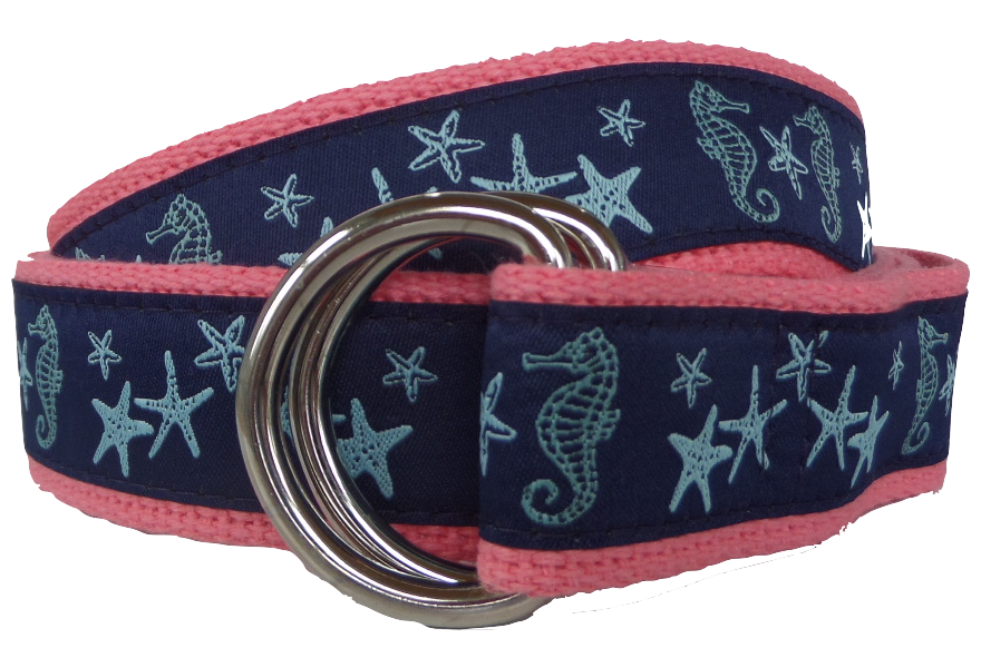 This novelty seahorse and starfish print was designed by us and made for you! This ribbon belt is from our Signature Series Line. Easily show off your casual style and pair this belt with any style khakis, jeans or your favorite cargo short. Each belt is hand made in the U.S.A and made to order.