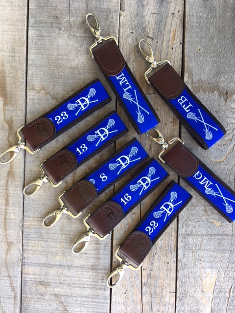 Our art team will help you with your team colors to make a custom look with our shop lacrosse ribbon. Let us help you put together key chains, belts, bags...etc. Customize it even further with leather belt stamping and personal monograms.