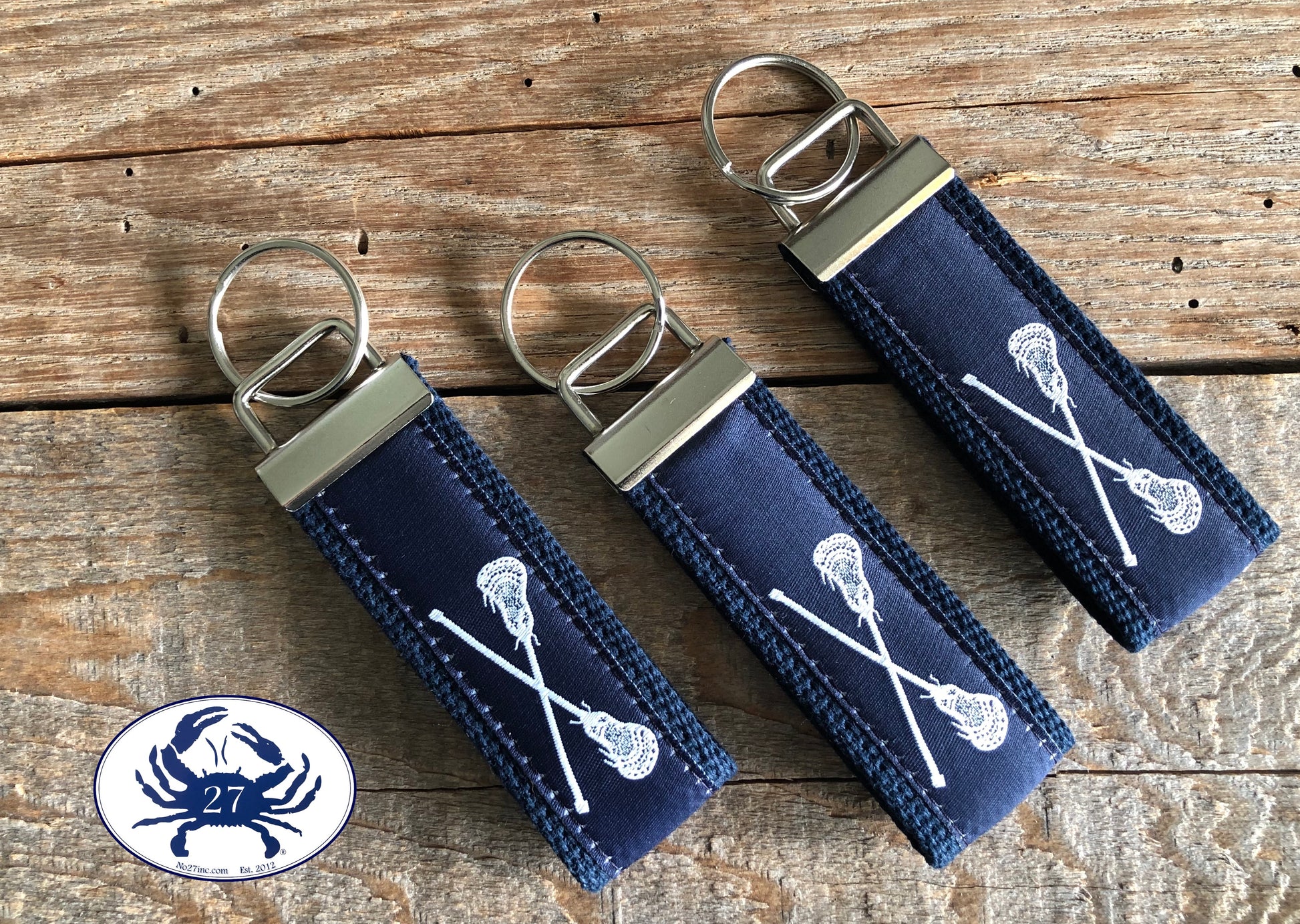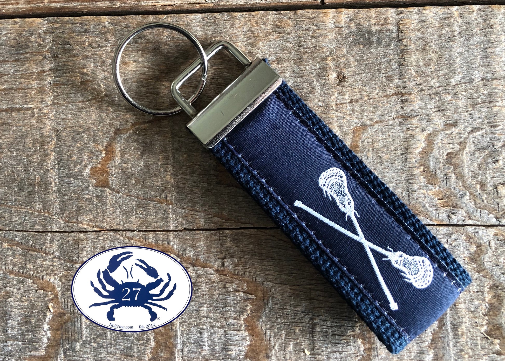 Have fun with this fresh and colorful key chain. This key chain features 'White Lacrosse Sticks on Navy' ribbon for a fun classic style. This key chain is made to order, so you can select an alternate webbing color or length. The key chain is pictured in 4" in length (not including the o-ring, which is an additional .5")